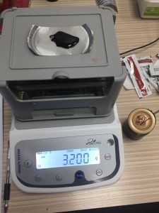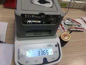 • 將2號阿膠膏體液置于稱重臺上,屏幕出現(xiàn)空氣中阿膠液的重量為3.365,按MODE鍵,就記錄了阿膠液在空氣中的重量了。