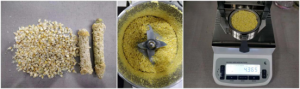 - 將玉米一粒粒掰開,放入攪拌機中進行攪拌,充分攪拌成玉米面后,用實驗勺取365g玉米面均勻鋪在樣品盤上,設置好合適的溫度后蓋下上蓋,按下“START”鍵開始測試;蜂鳴兩聲后,儀器自動停機,測試結束,可在液晶顯示屏查看測試后玉米面的水含量為47.02%;