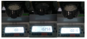 2. 將防風(fēng)盤(pán)、支架、樣品盤(pán)一一裝好,接通電源,按下開(kāi)機(jī)鍵,顯示屏進(jìn)入開(kāi)機(jī)界面,首先按去皮鍵減去樣品盤(pán)重量,后將100g砝碼放入托盤(pán)進(jìn)行校準(zhǔn);