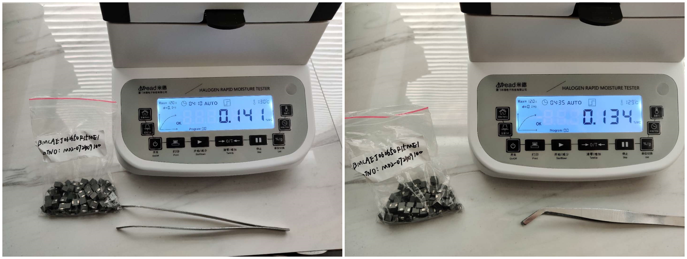 測(cè)試目的:在電感的生產(chǎn)過(guò)程中,磁芯是不可或缺的一部分,而磁芯是有磁性粉體組成的,在磁芯的生產(chǎn)過(guò)程中,從最開(kāi)始的原理入場(chǎng),到預(yù)燒,到驗(yàn)收,都需要對(duì)水分含量進(jìn)行檢測(cè),減少水分含量太高對(duì)產(chǎn)品功效的影響。