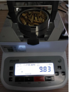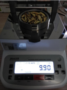 - 測(cè)試甘草:為了使測(cè)試過程中甘草水分儀將甘草烘干烘透,我們將甘草分散開來(lái),以便溫度能滲透進(jìn)甘草內(nèi)部。取6克多甘草平鋪不銹鋼托盤中,用鑷子將甘草平鋪均勻,我們將溫度設(shè)置在105℃,按“START”鍵開始測(cè)試,21分46秒后檢測(cè)結(jié)束,檢測(cè)數(shù)據(jù)顯示9.90%;