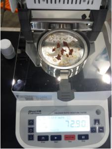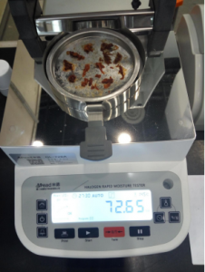 用鑷子提取8克豬肉肉末,置于不銹鋼托盤中,用鑷子將牛肉肉末平鋪均勻,溫度設(shè)置145℃用儀器進(jìn)行加熱,檢測結(jié)束,檢測數(shù)據(jù)顯示72.65%;為了檢測儀器的精確性,待儀器溫度降至50℃以下時(shí)進(jìn)行第二次測量,用實(shí)驗(yàn)勺提取8克豬肉肉末,置于不銹鋼托盤中,用實(shí)驗(yàn)勺將面粉平鋪均勻,溫度設(shè)置145℃用儀器進(jìn)行加熱,后檢測結(jié)束,檢測數(shù)據(jù)顯示72.90%;?用實(shí)驗(yàn)勺提取8克豬肉肉末,置于不銹鋼托盤中,用實(shí)驗(yàn)勺將豬肉平鋪均勻,溫度設(shè)置150℃用儀器進(jìn)行加熱后檢測結(jié)束,檢測數(shù)據(jù)顯示72.82%。實(shí)驗(yàn)結(jié)果所得數(shù)值較為準(zhǔn)確,儀器檢測精度較高。