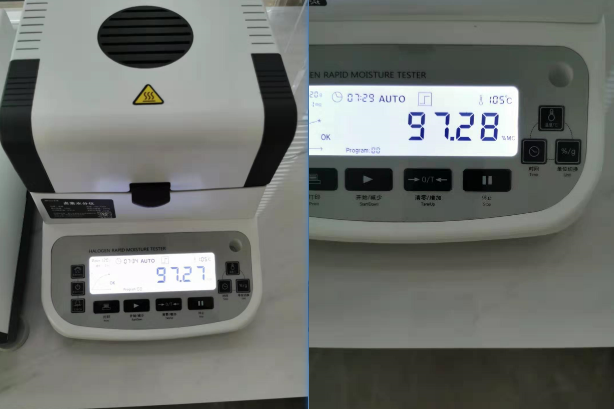 第一步、給測(cè)試儀接上電源,調(diào)整水平后. 在稱量盤上墊層玻璃纖維紙,按清零鍵.搖動(dòng)乳液以后 取3克左右鋪勻在盤中,按開(kāi)始測(cè)試,儀器根據(jù)失重率自動(dòng)停機(jī),此時(shí)屏幕上顯示的是水分值97.27%,再按單位鍵,可切換顯示為固含量值2.73%