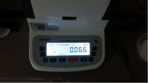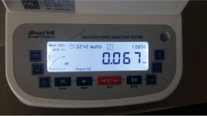 測(cè)試樣品3:為了檢測(cè)儀器的精確性,待儀器溫度降至30℃(常溫)以下時(shí)進(jìn)行第二次測(cè)量,用藥匙取樣10-12g,用藥匙取樣10-12g纖維紙上,溫度設(shè)置85℃用儀器進(jìn)行加熱,約3分鐘后檢測(cè)結(jié)束,檢測(cè)數(shù)據(jù)顯示0.067%;