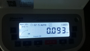 測(cè)試樣品2:為了檢測(cè)儀器的精確性,待儀器溫度降至30℃(常溫)以下時(shí)進(jìn)行第二次測(cè)量,用藥匙取樣10-12g,用藥匙取樣10-12g纖維紙上,溫度設(shè)置85℃用儀器進(jìn)行加熱,約3分鐘后檢測(cè)結(jié)束,檢測(cè)數(shù)據(jù)顯示0.093%;