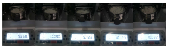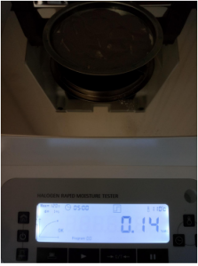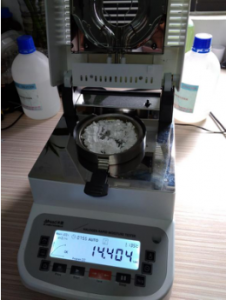 • 測(cè)試混合淀粉:為了使測(cè)試過程中混合淀粉水分儀將混合淀粉烘干烘透,我們將混合淀粉攤成分散狀,以便溫度能滲透進(jìn)去。取5克左右混合淀粉末置于不銹鋼托盤中,用鑷子將混合淀粉末平鋪均勻,為避免混合淀粉烘烤后變焦,我們將溫度設(shè)置在135℃,按“START”鍵開始測(cè)試,7分55秒后檢測(cè)結(jié)束,檢測(cè)數(shù)據(jù)顯示14.404%;