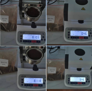 測(cè)試樣品1:用藥匙取樣10-12g,溫度設(shè)置85℃用儀器進(jìn)行加熱,約3分鐘后檢測(cè)結(jié)束,檢測(cè)數(shù)據(jù)顯示0.061%;