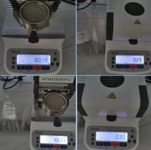 第一次,因樣品3屬金屬粉末,密度較大,取10克樣品3#粉末,置于不銹鋼托盤中,用鑷子將金屬粉末平鋪均勻,溫度設(shè)置110℃用儀器進(jìn)行加熱,定時(shí)5分鐘后檢測(cè)結(jié)束,檢測(cè)數(shù)據(jù)顯示0.15%;