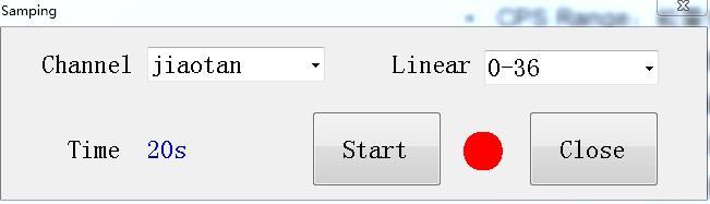 首先選中需要標(biāo)定的通道和線性。如上圖4.3所示:通道為選擇jiaotan(根據(jù)現(xiàn)場可以選擇新建的通道)?;然后選擇線性為:0-36(根據(jù)實際情況選擇);點Start按鈕,開始啟動取樣。啟動后指示燈變?yōu)榫G色,Time 為采樣倒計時,當(dāng)此數(shù)據(jù)為0時表示取樣完成。最后點Close關(guān)閉窗體按鈕完成取樣。
